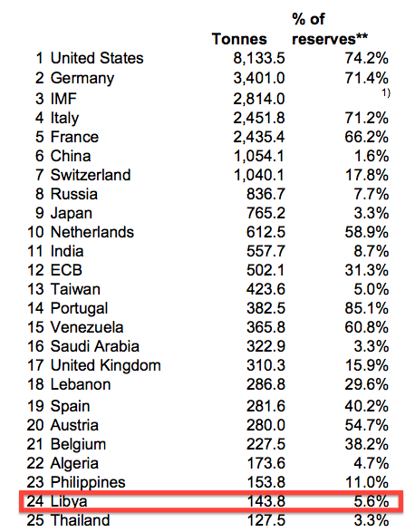 A country’s wealth would depend on how much gold it had and not how many dollars it traded. And Libya has 144 tons of gold. The UK, for example, has twice as much, but ten times the population.“If Gaddafi had an intent to try to re-price his oil or whatever else the country was selling on the global market and accept something else as a currency or maybe launch a gold dinar currency, any move such as that would certainly not be welcomed by the power elite today, who are responsible for controlling the world’s central banks,” says Anthony Wile, founder and chief editor of the Daily Bell. “So yes, that would certainly be something that would cause his immediate dismissal and the need for other reasons to be brought forward from moving him from power.”